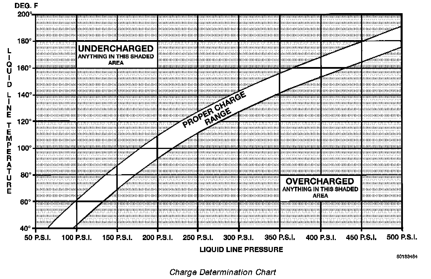 5. Observe liquid line pressure and temperature. Using the Charge Determination Chart determine where the system is currently operating. If the system is not in the proper range, reclaim all the refrigerant and recharge per A/C label.