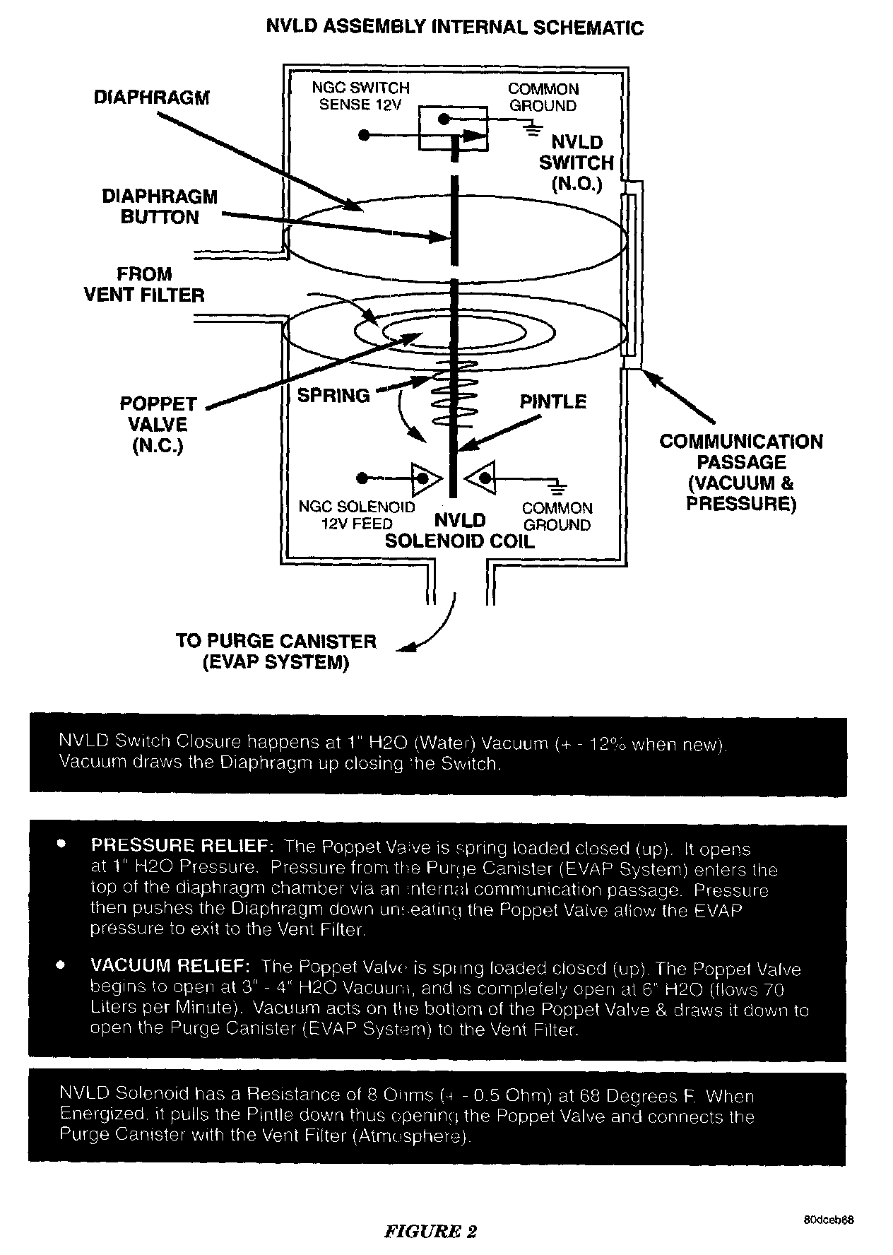 The normally closed valve in the NVLD is intended to maintain the seal on the evaporative system during the engine off condition. If vacuum in the evaporative system exceeds 3 inch to 6 inch H2O (0.75 to 1.5 kPa), the valve will be pulled off the seat, opening the seal. This will protect the system from excessive vacuum as well as allowing sufficient purge flow in the event that the solenoid was to become inoperative. The solenoid actuates the valve to unseal the canister vent while the engine is running. It also will be used to close the vent during the medium and large leak tests and during the purge flow check. This solenoid requires initial 1.5 amps of current to pull the valve open but after 100 ms. will be duty cycled down to an average of about 150 mA for the remainder of the drive cycle.