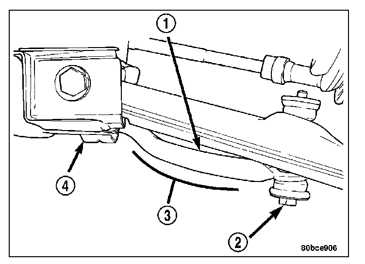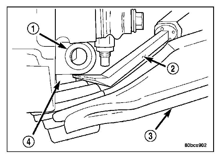 10. Remove the pencil strut (2) from the right front corner of the crossmember and body of the vehicle. Remove the washer (4) behind the strut from the torque strut bolt.