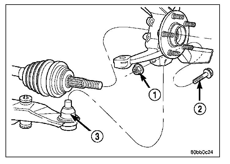 CAUTION: After removing the steering knuckle from the ball joint stud, do not pull outward on the knuckle. Pulling the steering knuckle outward at this point can separate the inner c/v joint on the driveshaft.