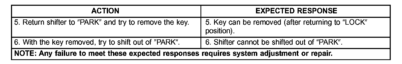 Refer to the chart for expected shifter response, depending on ignition key/switch and brake pedal positions.