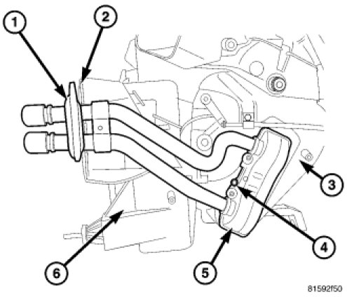 1. If removed, lubricate new O-rings with clean engine coolant and install them onto the heater core tubes. Connect the tubes to the heater core (5) and install the retaining clips.