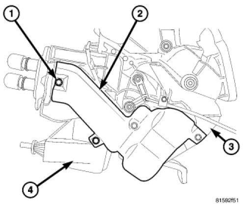 5. Position the heater core cover (2) onto the driver side of the air distribution housing (3) and HVAC housing (4).