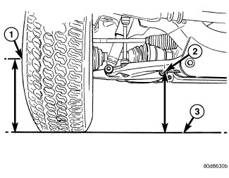 b. Center of the front face of bolt on the rear leg of Lower control arm (2) to ground vertical distance (3).