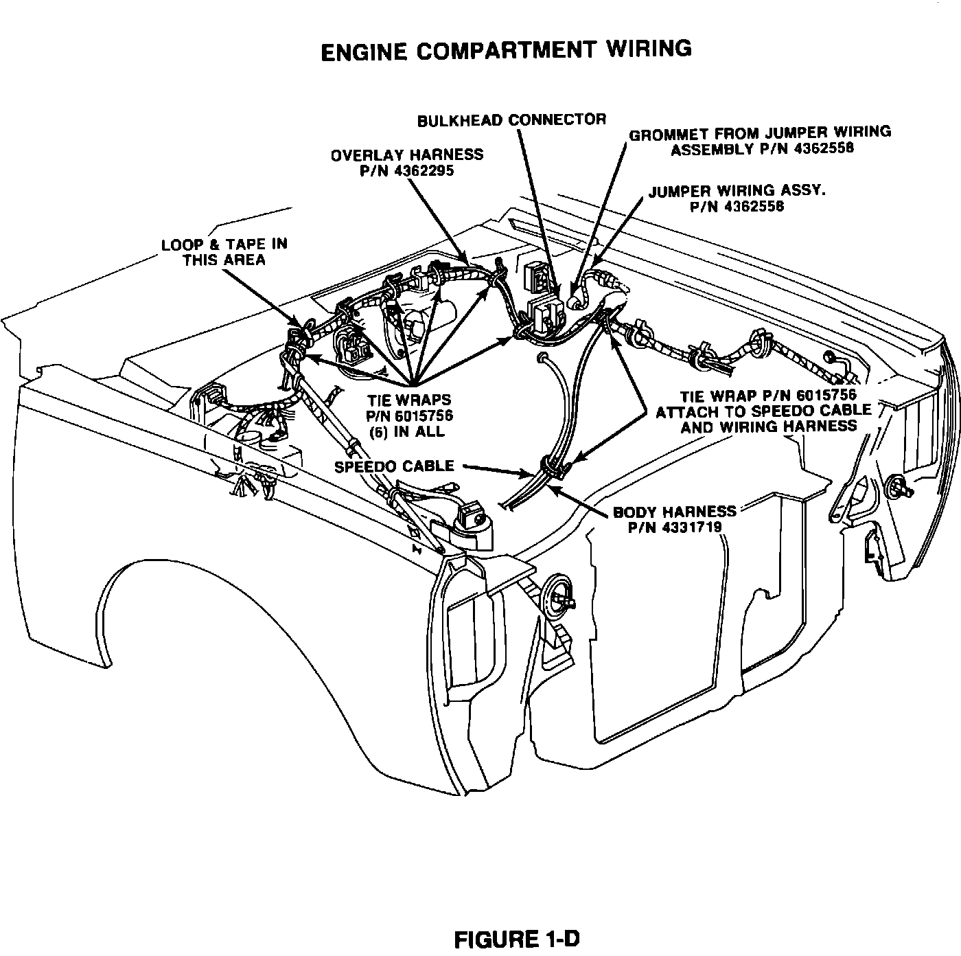 3. At the engine compartment, route and secure the body wiring harness to the speedometer cable using one (1) tie wrap, PN 6015756, and to the bulkhead wiring using one (1) tie wrap (Figure 1-D).