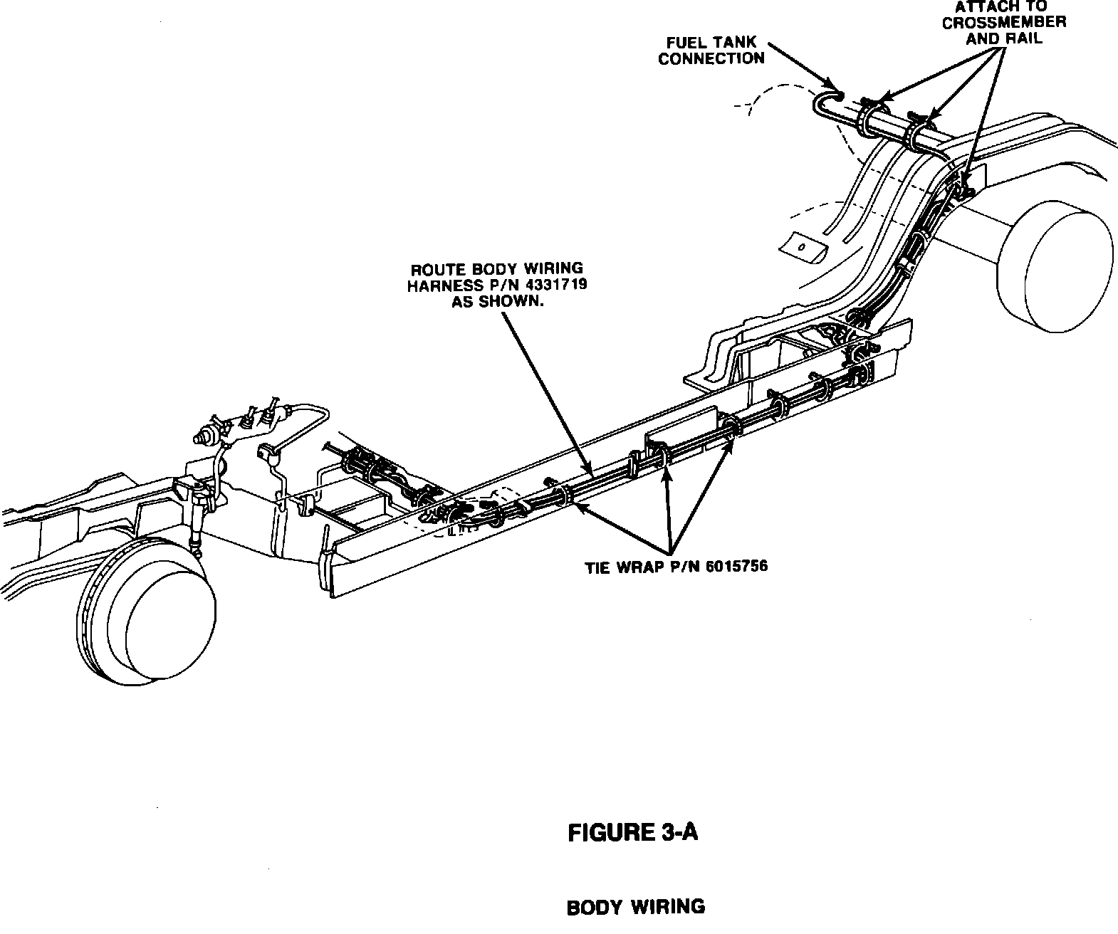 1. Route and secure the body wiring harness, PN 4331719, along the right rear crossmember to the left rail using two (2) tie wraps, PN 6015756 (Figure 3-A).