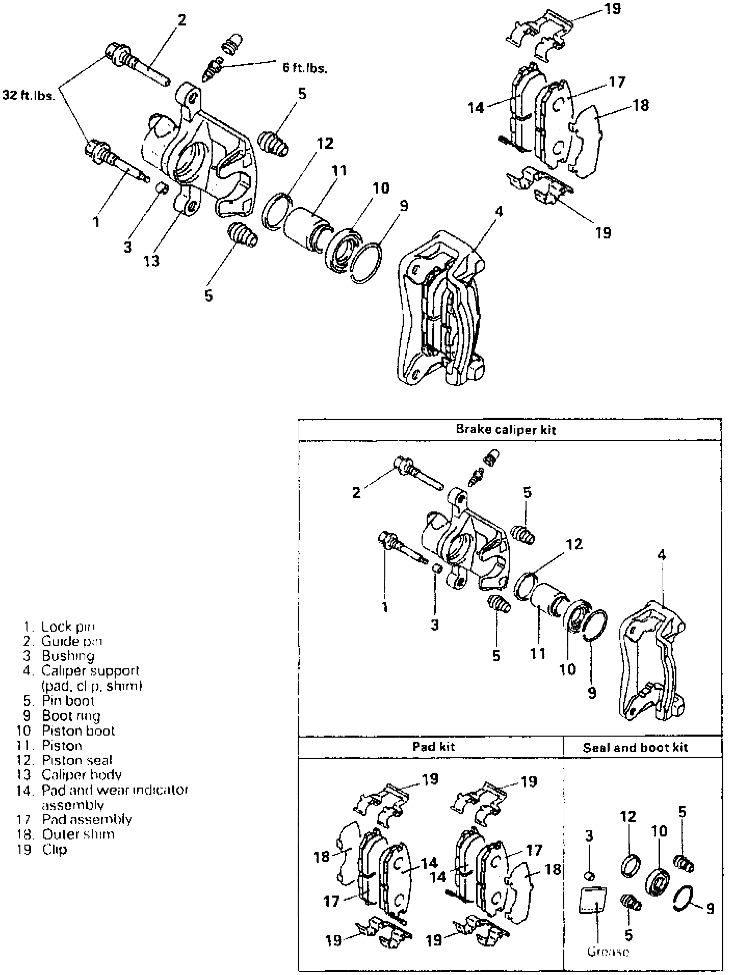6. Install upper and lower pad clips, pad assemblies and inner and outer shims into support mounting.