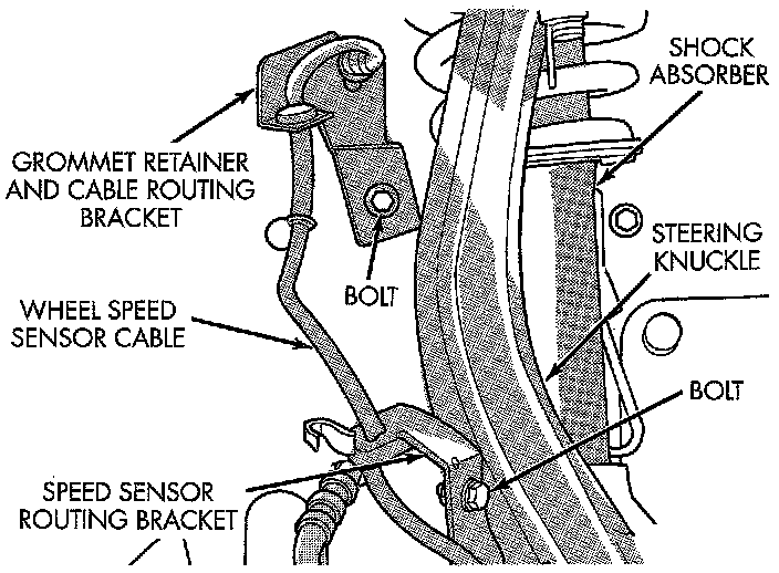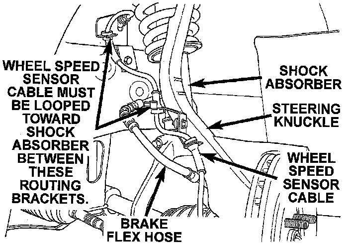 CAUTION: When installing the wheel speed sensor cable routing bracket on the steering knuckle, the speed sensor cable must be looped toward the shock absorber. If speed sensor cable is not routed in this direction it will rub against the tire or wheel, damaging the speed sensor cable.