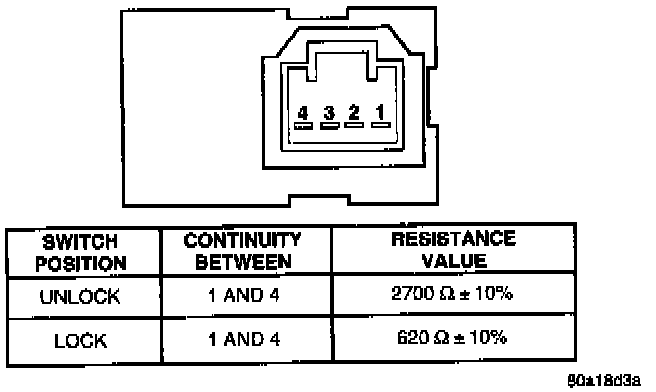 Remove the door lock switch from its mounting location. Refer to Door Lock Switch Removal and Installation procedures. Using an ohmmeter, test door lock switch continuity Refer to and move the switch to the Lock and Unlock positions. If the resistance values are not obtained, replace the switch.