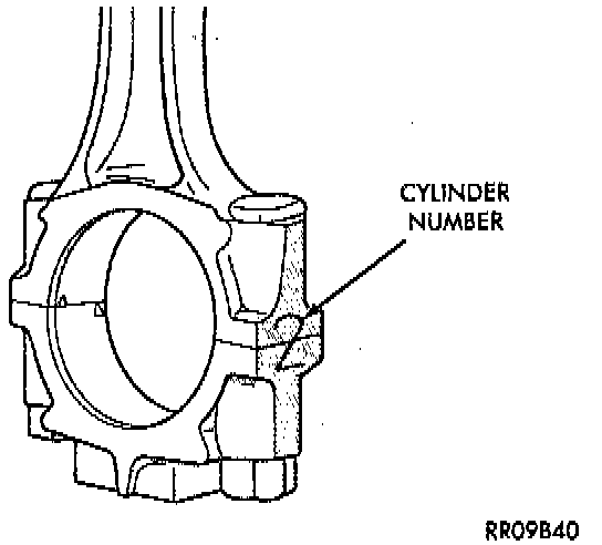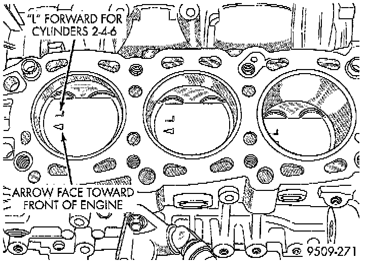 1. Identify pistons with matching cylinder. The pistons are not interchangeable from bank to bank. Pistons with the letter R and arrow toward the front of engine are to be installed in cylinders 1-3-5. Pistons with the letter L and arrow toward the front of engine are to be installed in cylinders 2-4-6.