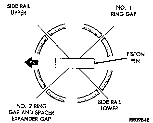 1. Before installing pistons and connecting rod assemblies into the bore, be sure that compression ring gaps are staggered so that neither is in line with oil ring rail gap.