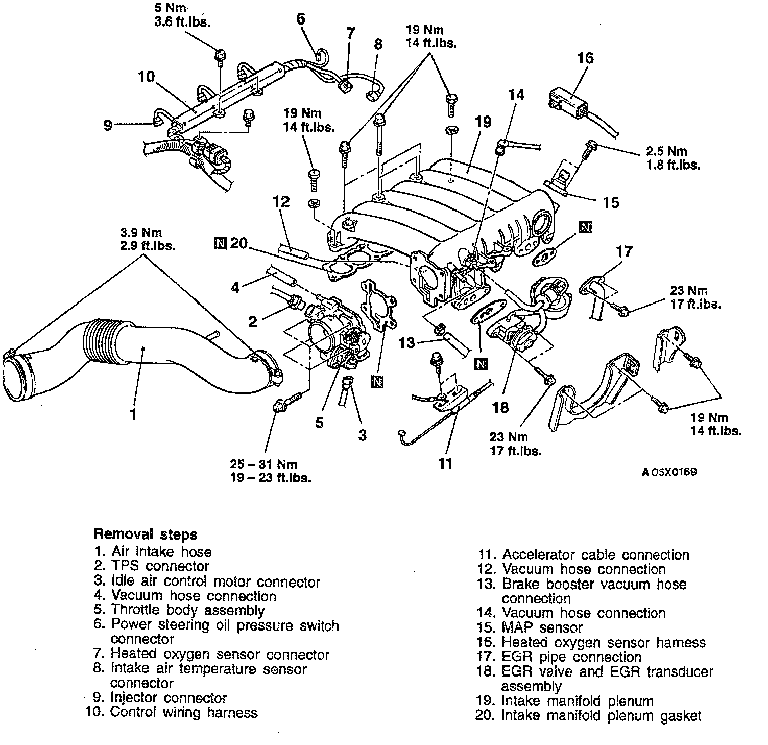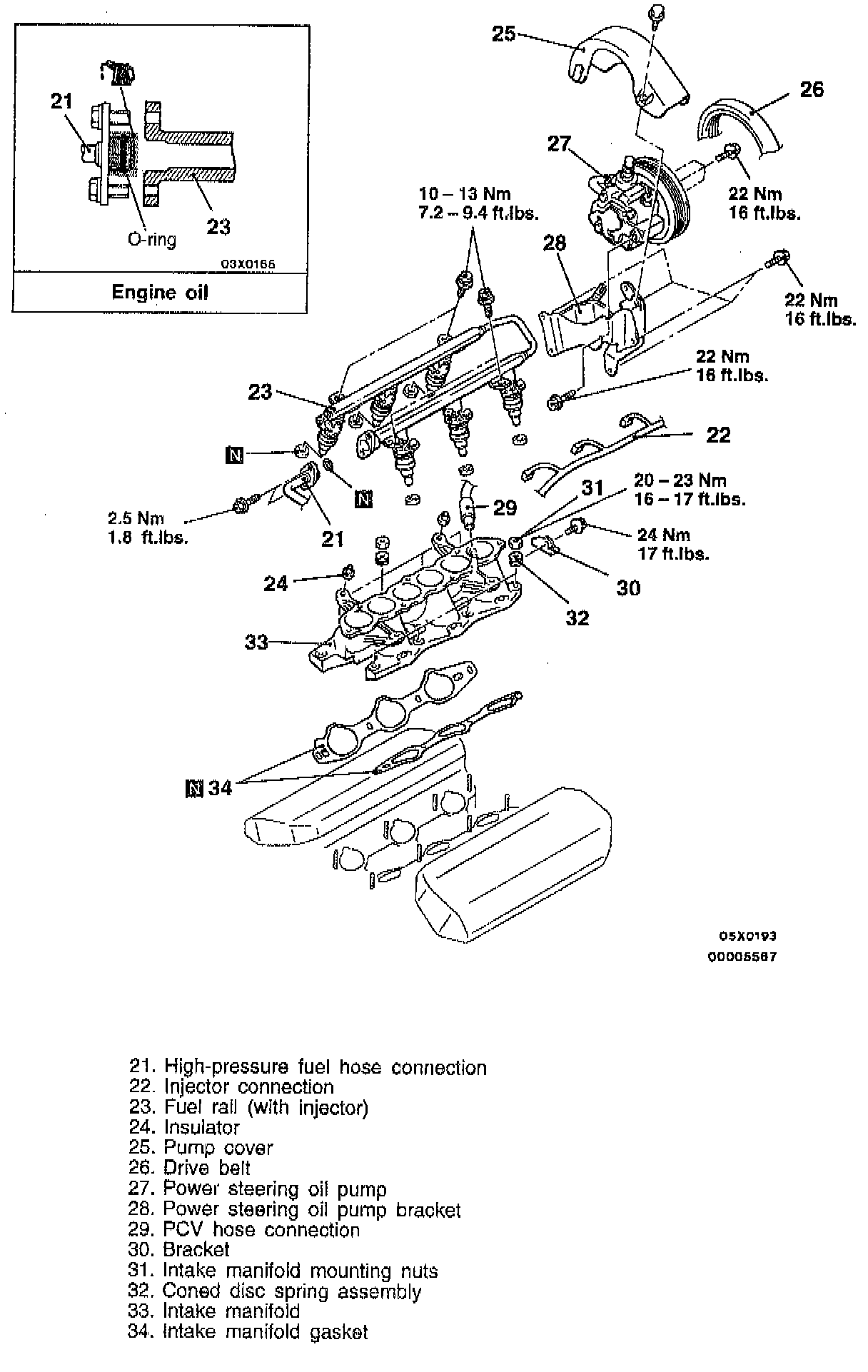 NOTE: Suspend the removed power steering oil pump (by using wire or similar material) at a place where no damage will be caused during removal/installation of the intake manifold.