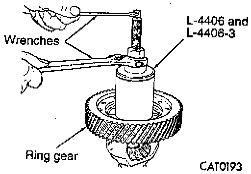 11. Remove differential bearing from ring gear side with Bearing and Gear remover L-4406 and L-4406-3, or equivalents.