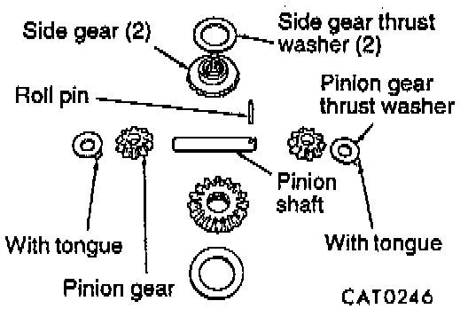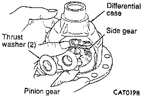 15. Remove pinion gears, side gears and tabbed thrust washers by rotating pinion gears to opening in differential case.