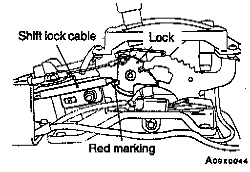 4. Fasten the shift lock cable at the position where the end of the shift lock cable is positioned above the red marking.