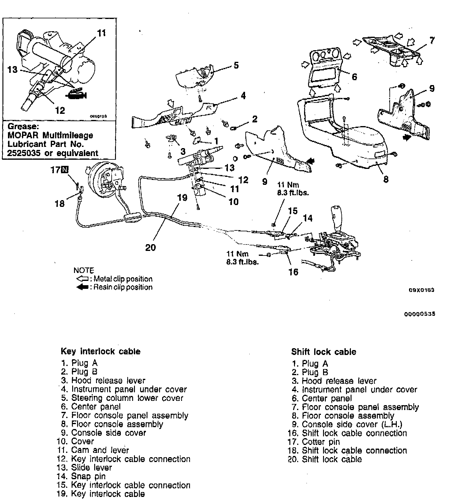 2. Secure the section between the metals of the shift lock cable and key interlock cable with the clip of the steering cover assembly.