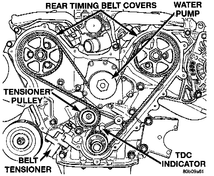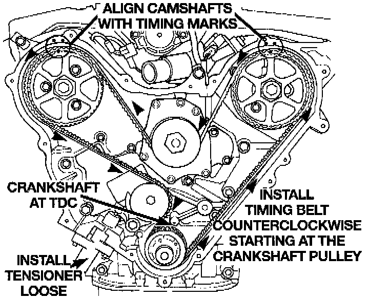 CAUTION: Align the camshaft sprockets between the marks on rear belt covers before timing belt removal or damage to valve and/or pistons could occur.