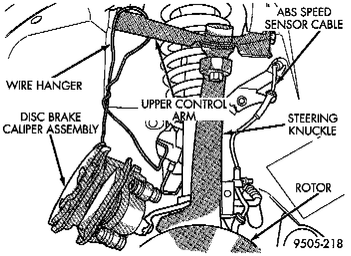 5. Support caliper from upper control arm to prevent weight of caliper from being supported by brake flex hose. Supporting disc brake caliper from flex hose can damage the hose.