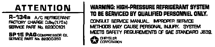 - AVOID BREATHING A/C REFRIGERANT AND LUBRICANT VAPOR OR MIST EXPOSURE MAY IRRITATE EYES, NOSE AND THROAT. USE ONLY APPROVED SERVICE EQUIPMENT MEETING SAE REQUIREMENTS TO RECLAIM R-134a SYSTEMS. IF ACCIDENTAL SYSTEM DISCHARGE OCCURS, VENTILATE WORK AREA BEFORE RESUMING SERVICE.