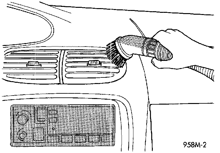 Use a vacuum cleaner to remove any residual powder from the vehicle interior. Work from the outside in to avoid kneeling or sitting in a contaminated area. Vacuum the heater and A/C outlets as well. If the heater or air conditioner was in RECIRC mode at time of airbag deployment, operate blower motor on low speed and vacuum powder residue expelled from the heater and A/C outlets. Multiple vacuum cleaning may to necessary to decontaminate the interior of the vehicle.
