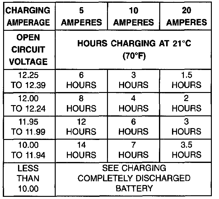 A completely discharged large heavy-duty battery may require more recharging time than a completely discharged small capacity battery, refer to Battery Charging Timetable for charging times.
