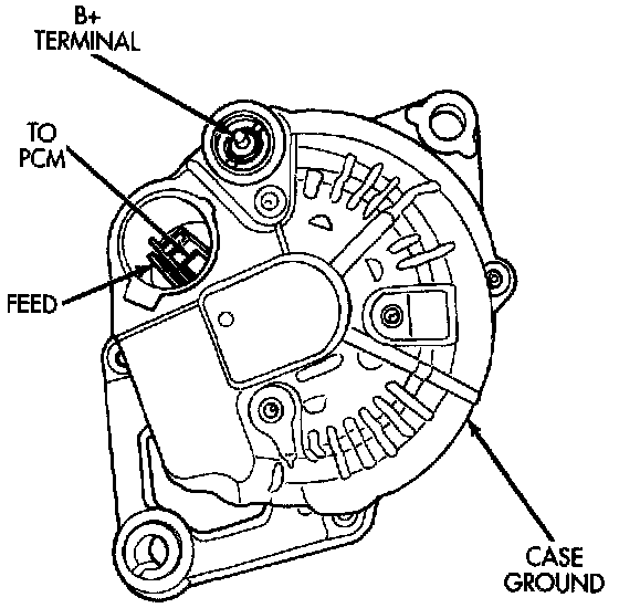 b. Touch the positive lead of voltmeter to the B+ output terminal stud on the generator (not the terminal mounting nut). Voltage should be no higher than 0.6 volts. If voltage is higher than 0.6 volts, touch test lead to terminal mounting stud nut and then to the wiring connector. If voltage is now below 0.6 volts, loose for dirty, loose or poor connection at this point. Also check condition of the generator output wire-to-PDC positive connector. A voltage drop test may be performed at each (- ground) connection in this circuit to locate the excessive resistance.