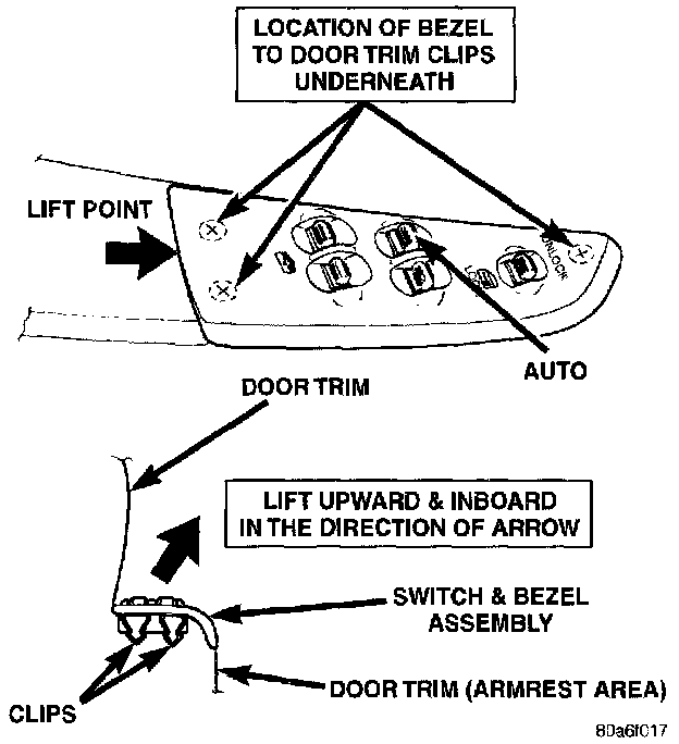 1. Start at the rear center of the bezel. Using your fingers or a trim stick, lift the bezel upwards and slightly inboard to disconnect the two rear clips. Use care not to mar the door trim.