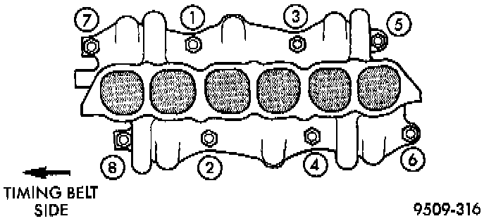 1. Install intake manifold with new gaskets. Tighten in sequence shown in to 21 Nm (185 inch lbs.).