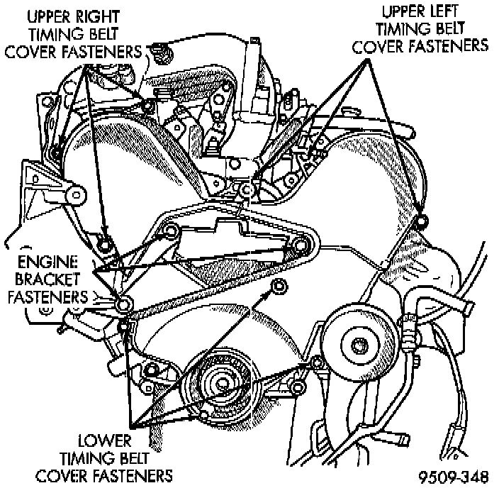 NOTE: To remove right/rear timing belt cover, the power steering pump bracket must be removed.