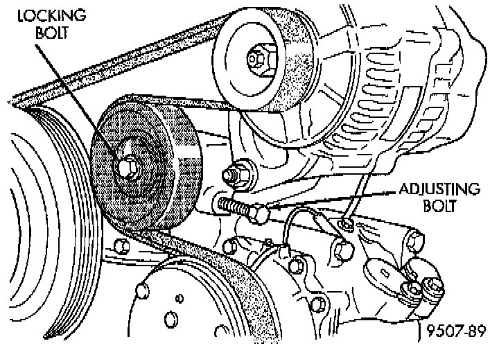 To adjust the air conditioning and generator drive belt, loosen the idler pulley bolt and adjust belt tension by turning adjusting screw. Tighten pulley bolt to 54 Nm (40 ft. lbs.) after adjustment.