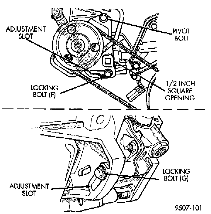 3. Install the belt. Adjust belt tension with 1/2 inch breaker bar installed in adjusting bracket. See Belt Tension Chart.