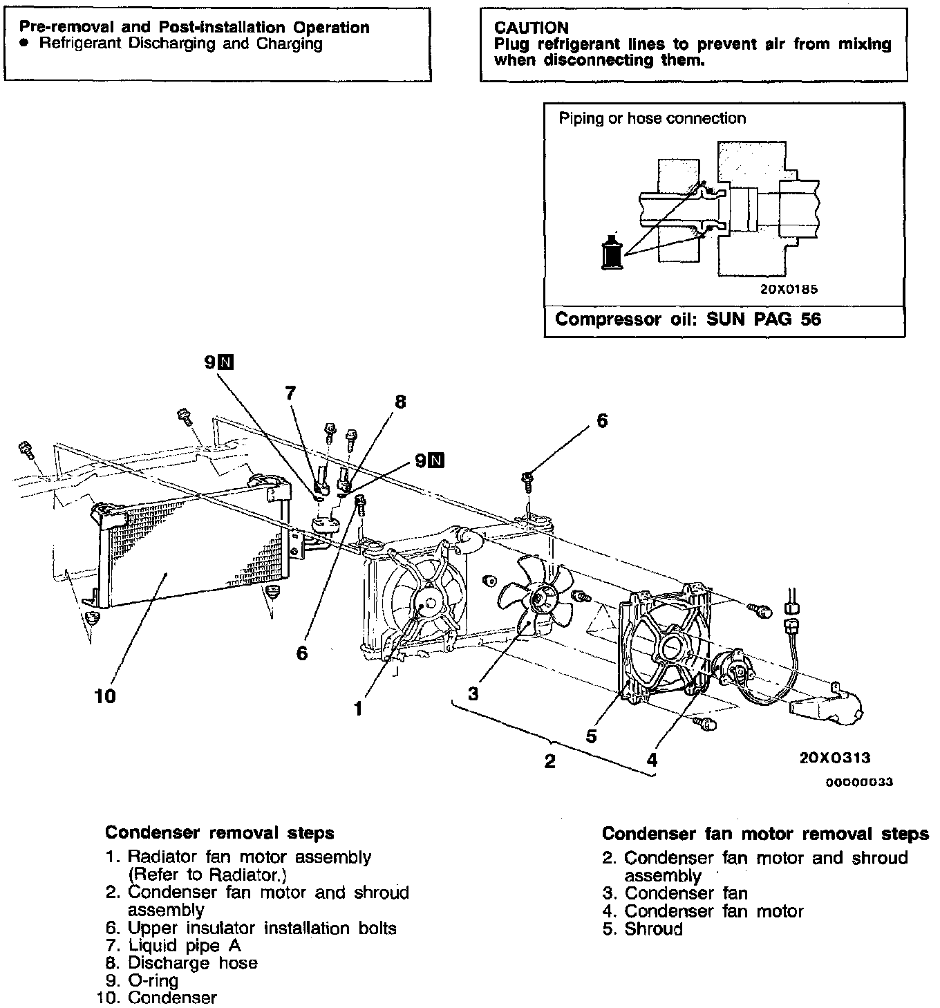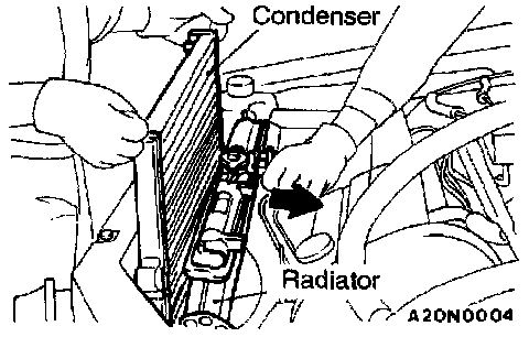 Move the radiator to the engine side and then lift up the condenser to remove it.