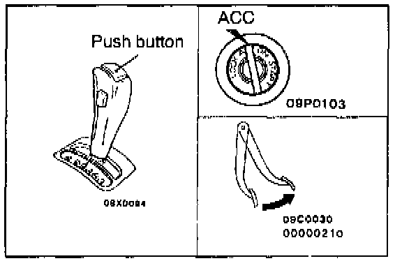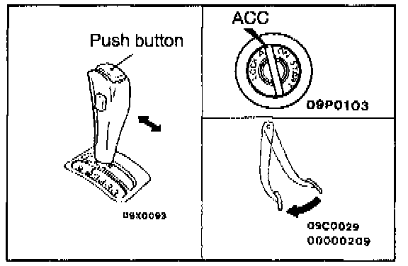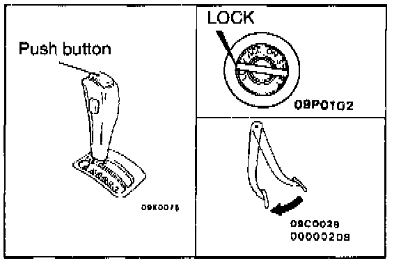 2. Check that, under the following conditions, the selector lever can be moved from the "P" position to any other position. Press the button a few times and check to be sure that the selector lever moves smoothly.