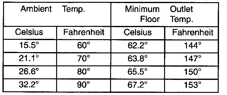 Engine coolant is provided to the heater system by two 16 mm (5/8 inch inside diameter) heater hoses. With engine idling at normal running temperature, set the control to maximum heat, floor, and high blower setting. Using a test thermometer, check the air temperature coming from the floor outlets, refer to Temperature Reference Table.