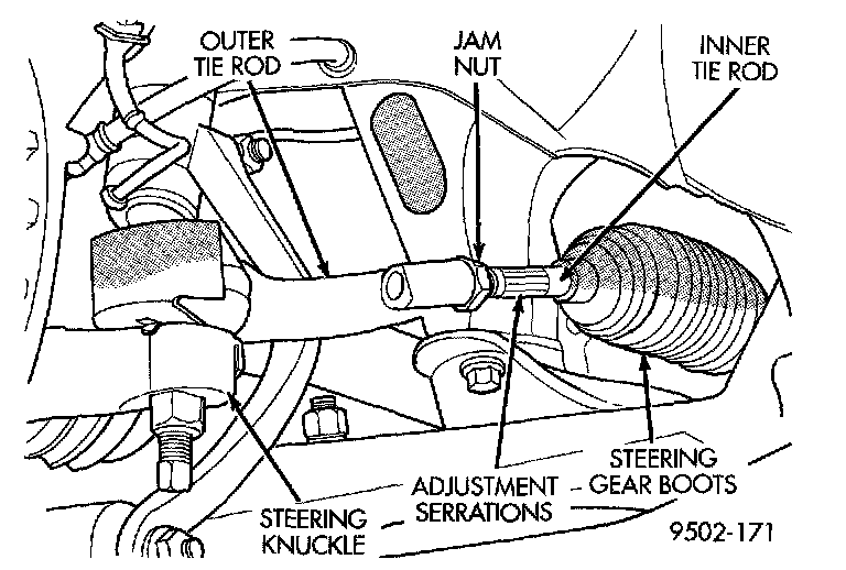 2. Loosen front inner to outer tie rod end jam nuts. Grasp inner tie rods at serrations and rotate inner tie rods of steering gear to set front toe to the preferred toe specification.