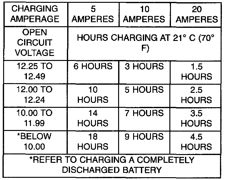 A completely discharged large heavy-duty battery may require more recharging time than a completely discharged small capacity battery, refer to Battery Charging Timetable for charging times.