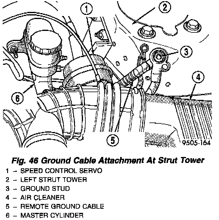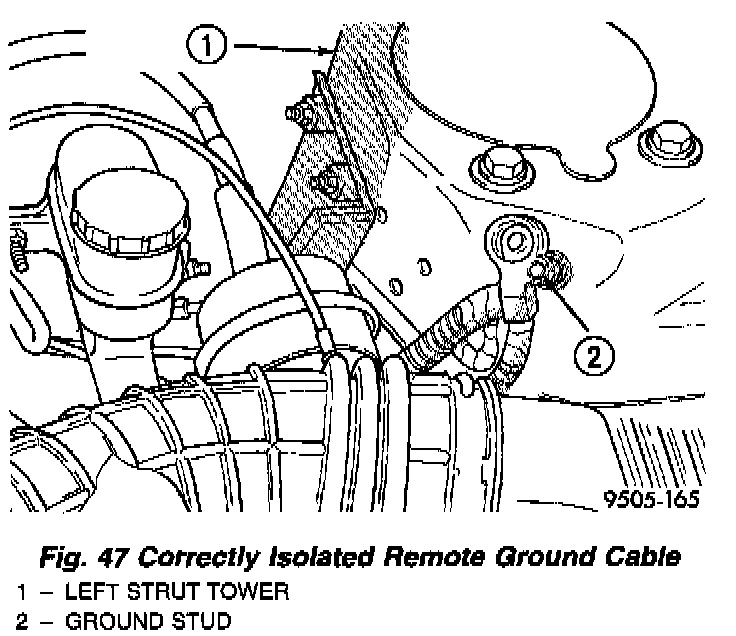 REMOVAL1. Remove the remote ground cable from the ground stud located on the left strut tower. Correctly isolate remote ground by installing the ground cable insulator on the strut tower ground stud as shown.