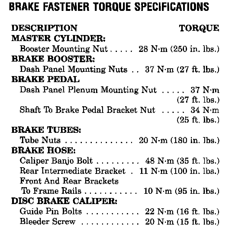 Brake Fastener Torque Specifications