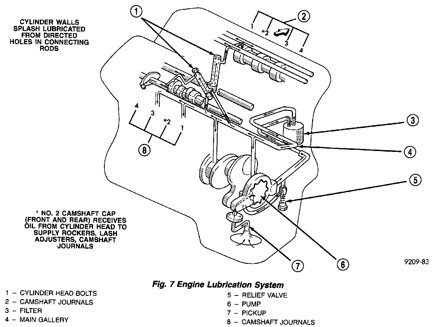 Engine oil, stored in the oil pan, is taken in and discharged the oil pump. Oil pressure is regulated by a relief valve located in the oil pump housing. The oil is fed through an oil filter and to the crankshaft journals from the oil gallery in the cylinder block. This gallery also feeds oil under pressure to the cylinder heads and camshaft journals. It then flows from the cylinder head passages to the rocker shafts to the rocker arm pivots and auto lash adjusters (Fig. 7).