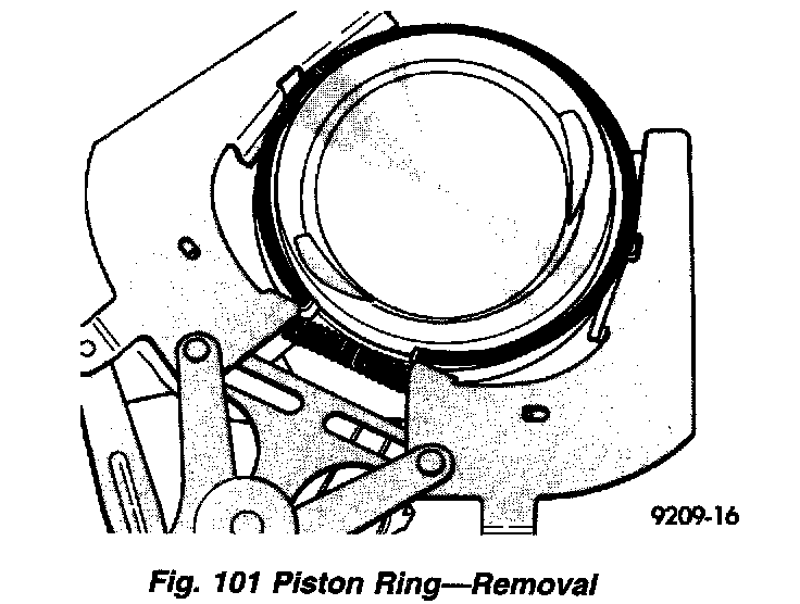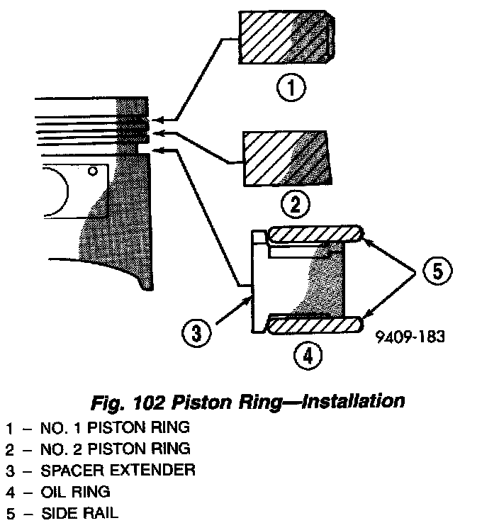1. The No. 1 and No. 2 piston rings have a different cross section. Install rings with manufacturers mark and size mark facing up, to the top of the piston (Fig. 102).
