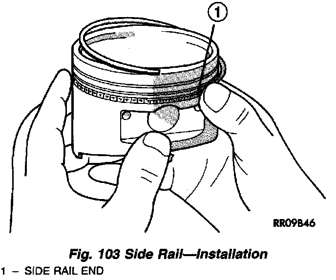 2. Install the side rails (upper rail first, then lower rail) by placing one end between the piston ring groove and the expander. Hold end firmly and press down the portion to be installed until side rail is in position. Do Not use a piston ring expander (Fig. 103).