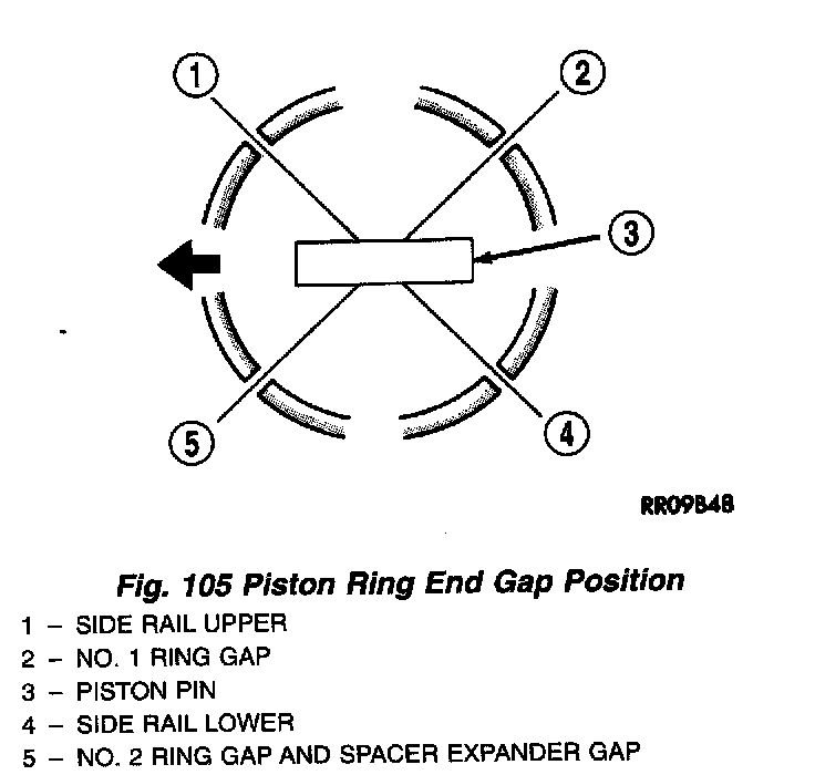 4. Position piston ring end gaps as shown in (Fig. 105).