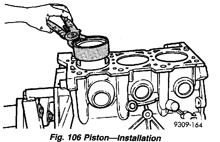 7. Tap the piston down in cylinder bore, using a hammer handle. At the same time, guide connecting rod into position on connecting rod journal (Fig. 106).