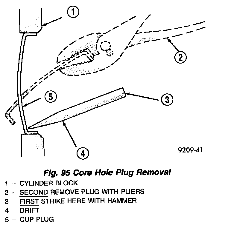 Using a blunt tool such as a drift or a screwdriver and a hammer, strike the bottom edge of the cup plug (Fig. 95). With the cup plug rotated, grasp firmly with pliers or other suitable tool and remove plug (Fig. 95).