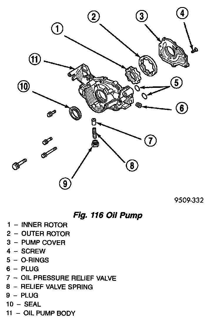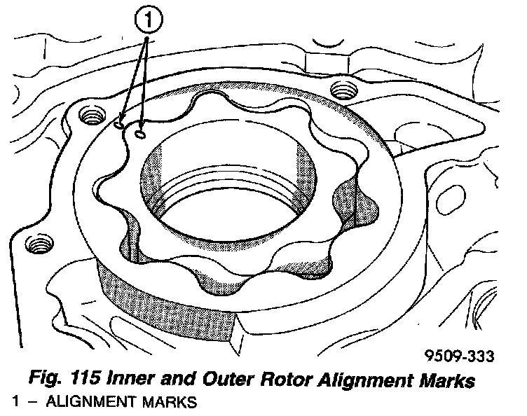 1. Assemble pump, using new parts as required with clean oil. Align marks on the inner and outer rotors when assembling (Fig. 115).