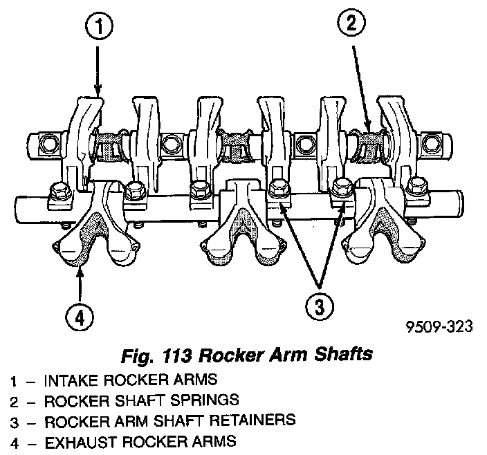 1. Identify the rocker arms and retainers for reassembly. Disassemble the rocker arm assemblies by removing the attaching bolts and spring clips from the shaft (Fig. 113).