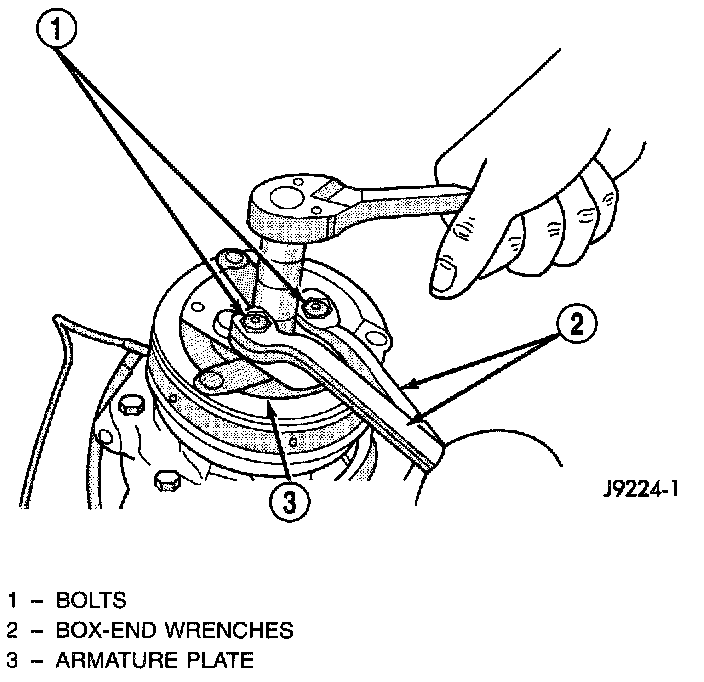 2. Install two (6 mm) bolts into the threaded holes in the armature plate. Hold bolts with two wrenches to prevent shaft from turning. Remove compressor shaft nut.