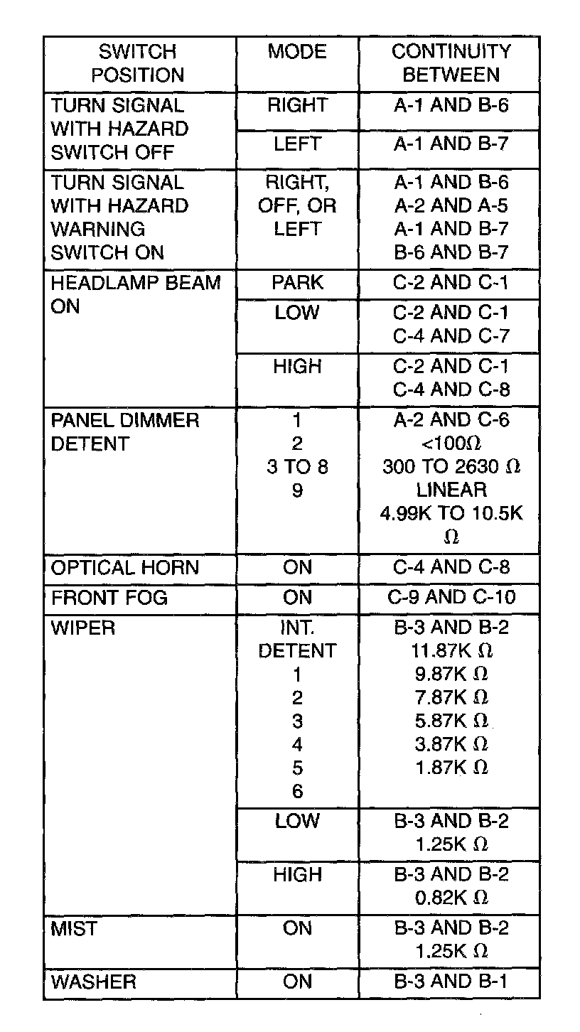 2. Using an ohmmeter, test for continuity (no resistance) between the terminals of the switch as shown in the Multi-Function Switch Continuity Test table.