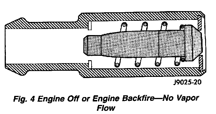 When the engine is not operating or during an engine backfire, the spring forces the plunger back against the seat. This prevents vapors from flowing through the valve.