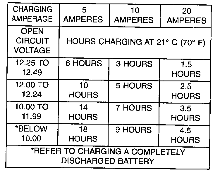 A completely discharged large heavy-duty battery may require more recharging time than a completely discharged small capacity battery, refer to Battery Charging Timetable for charging times.
